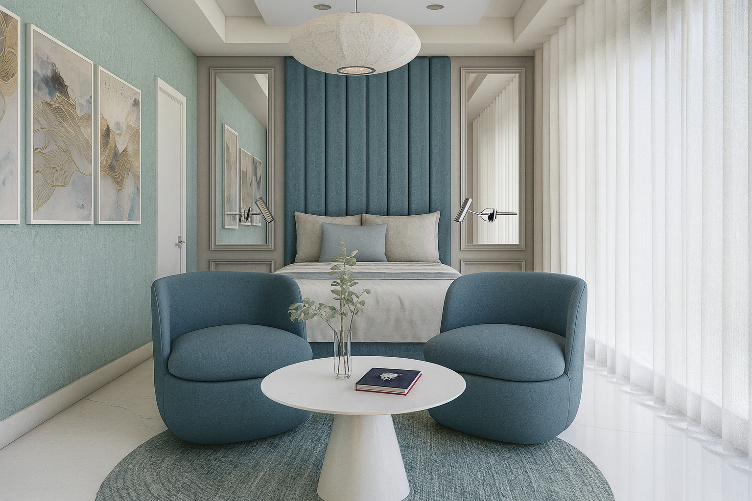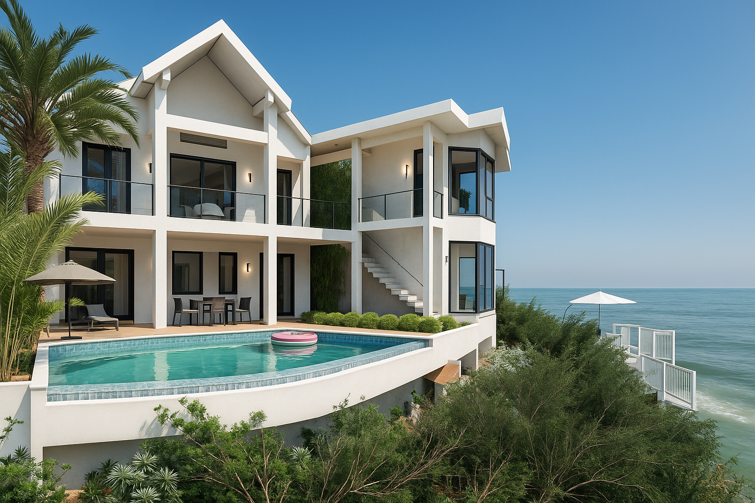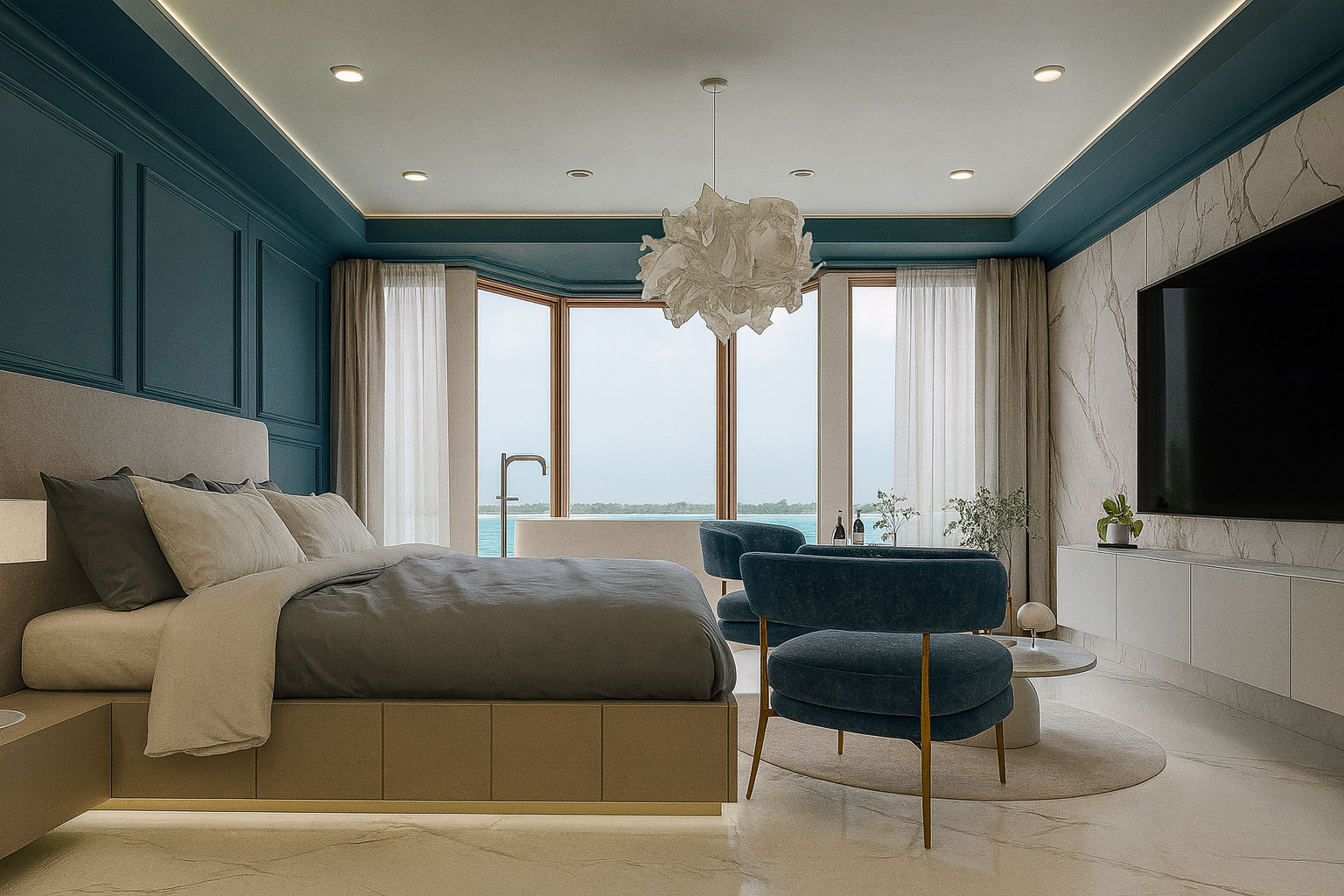 Con su ubicación privilegiada, la cabaña abraza la belleza del océano. Los tonos aguamarina del paisaje fluyen hacia los interiores, donde el mobiliario cuidadosamente seleccionado realza tanto la funcionalidad como la estética. El resultado es un refugio refinado y acogedor que armoniza con el medio ambiente y eleva la experiencia de habitar el espacio.