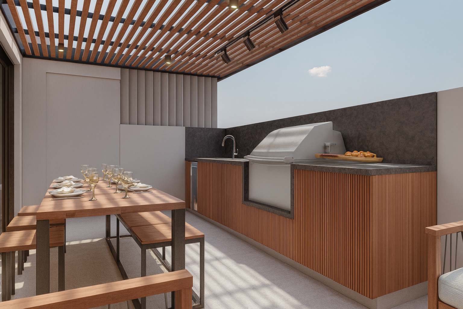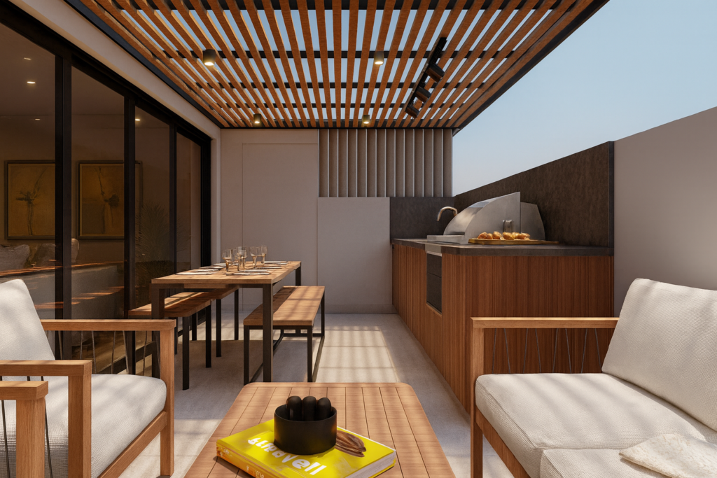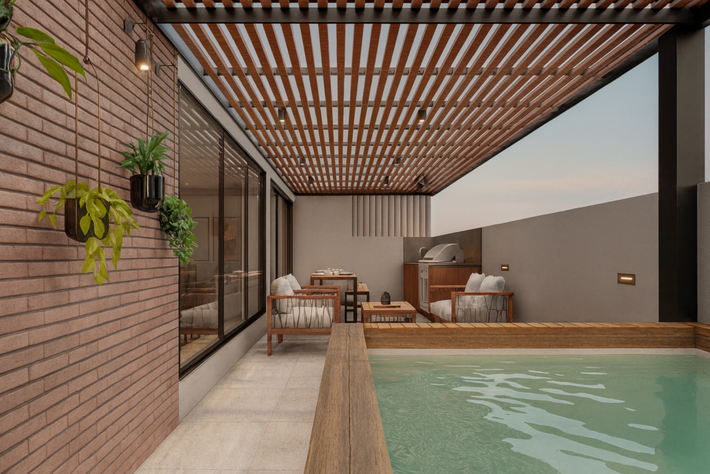 El proyecto también incluye una propuesta de ampliación en un segundo nivel para mejorar tanto la funcionalidad como el confort. Este nuevo piso introduce una amplia sala de estar, un espacio de trabajo con luz natural y una terraza exterior completamente integrada que cuenta con asador, pérgola y jacuzzi. En conjunto, estas adiciones crean una conexión fluida entre el interior y el exterior, al tiempo que amplían las áreas sociales y recreativas de la vivienda.