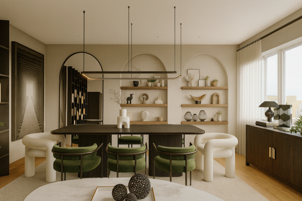Las formas suaves y orgánicas crean una sensación de calma, mientras que la paleta neutra se ve realzada por acentos vibrantes en verde, que aportan frescura y vitalidad a cada espacio.