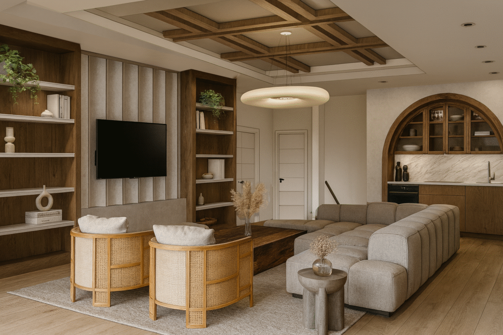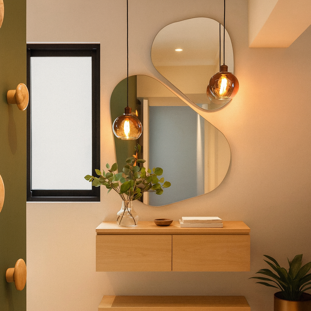 Tonos neutros cálidos se integraron con acentos de madera natural, detalles en verde fresco y texturas sutiles para crear un interior equilibrado y contemporáneo. El diseño de iluminación y los espejos se incorporaron cuidadosamente para ampliar visualmente los espacios, mientras que las formas orgánicas y los contrastes suaves aportaron confort y armonía.