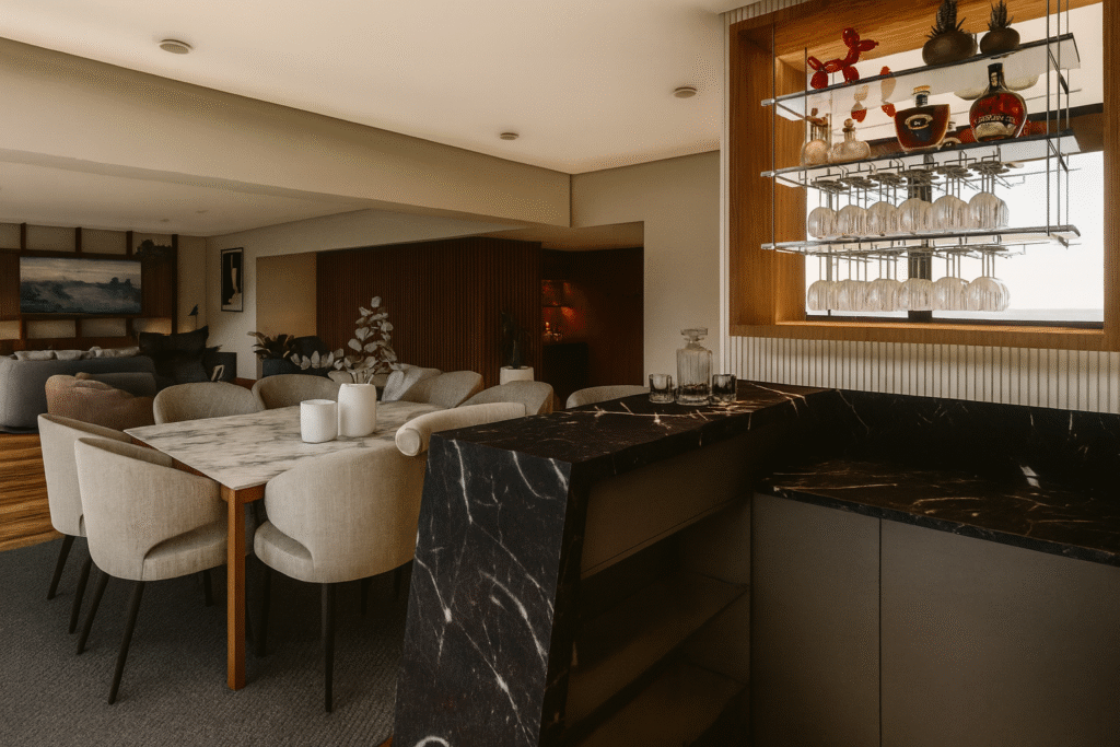 Cada espacio fue cuidadosamente curado para resaltar la elegancia y la funcionalidad: las áreas de sala y comedor presentan texturas sutiles e iluminación moderna, creando atmósferas acogedoras tanto para la soledad como para los encuentros sociales.