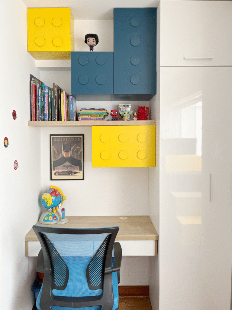 El diseño presenta una zona de estudio creativa, donde los módulos superiores de almacenamiento se inspiran en los icónicos bloques de Lego, convirtiendo el mobiliario en un elemento que fusiona decoración y juego. Estanterías abiertas y nichos permiten organizar libros, juguetes y colecciones, añadiendo un toque colorido y dinámico a la habitación.