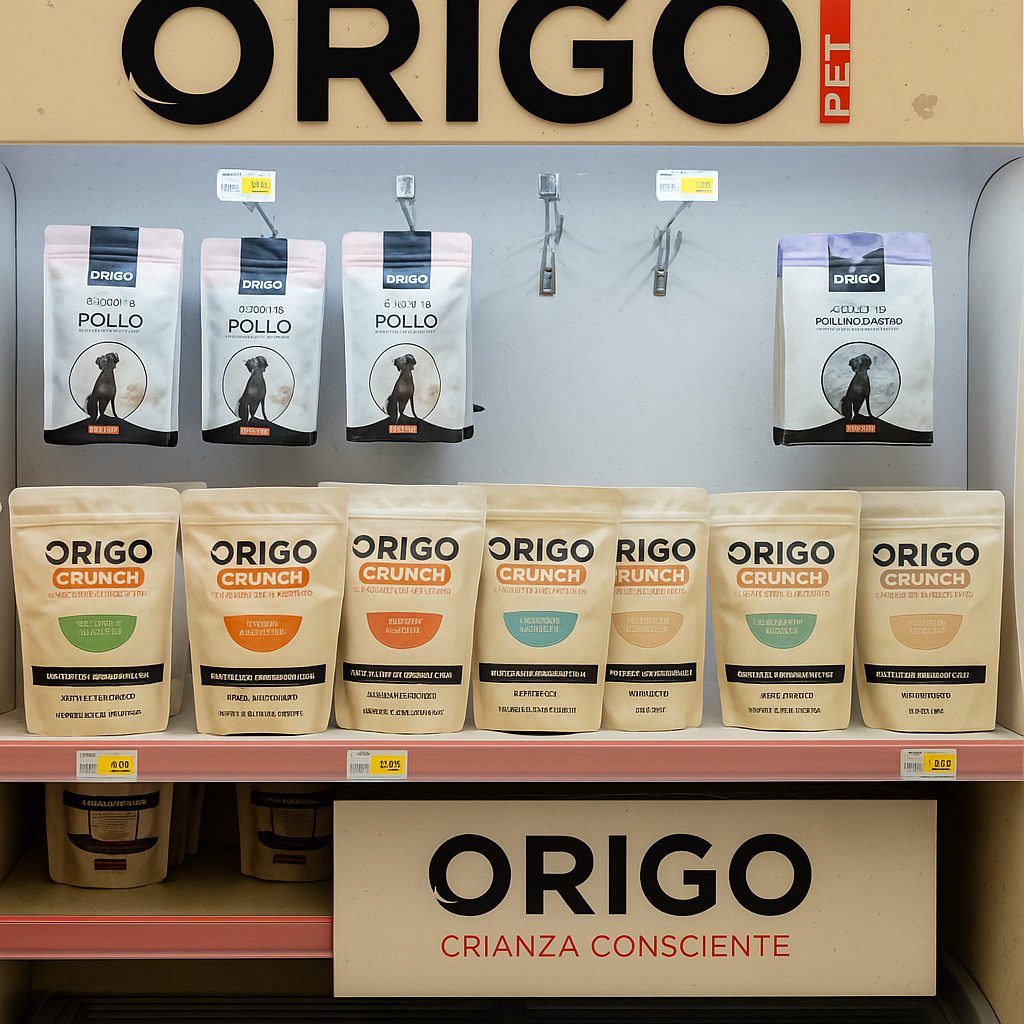 Este proyecto se centró en el diseño de módulos de exhibición retail para ORIGO, una marca de alimentos naturales para mascotas comprometida con una crianza consciente. El desafío consistió en crear un sistema de exhibición que no solo comunicara los valores de la marca, sino que también destacara en el punto de venta frente a los competidores tradicionales.